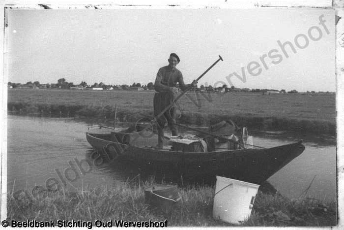 | Titel | : | Tuinder Herman Steltenpool varend met zijn motorschuit bij zijn land aan de Grote Kerksloot. |