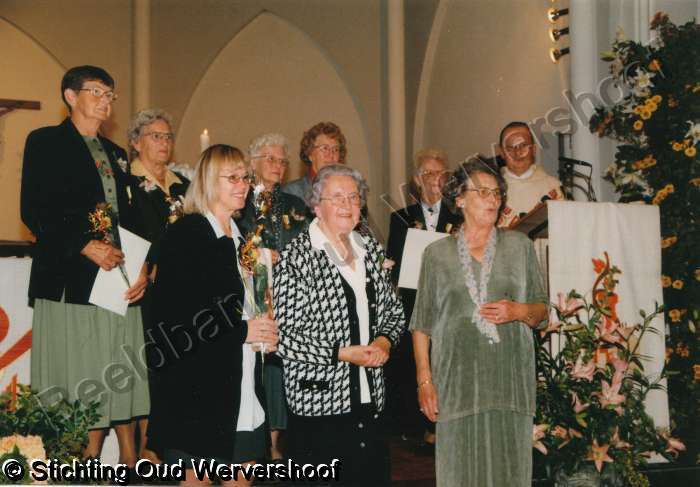 | Bijzonderheden | : | Git Lakeman-Koomen en Nel Sneeboer-Hauwert waren vanaf de oprichting lid. Martha van der Geest-Neefjes, de oprichter van het dameskoor, was enkele maanden ervoor overleden en kreeg de onderscheiding postuum uitgereikt via haar dochter Anneke. De leden achter deze drie jubilarissen waren allen 40 jaar lid en ontvingen de Gregoriuspeld: Annie Mathôt-Wijnker, Ciel Hooiveld-Vlaar, Jo van Ophem-Bakker, Tiny Hendriks-Bakker en Jo Bakker-Breg. Daarnaast pastoor Suidgeest. Zie ook Skriemer 21 2017: 'Tot nut ende vermaek: Het dameskoor'. |